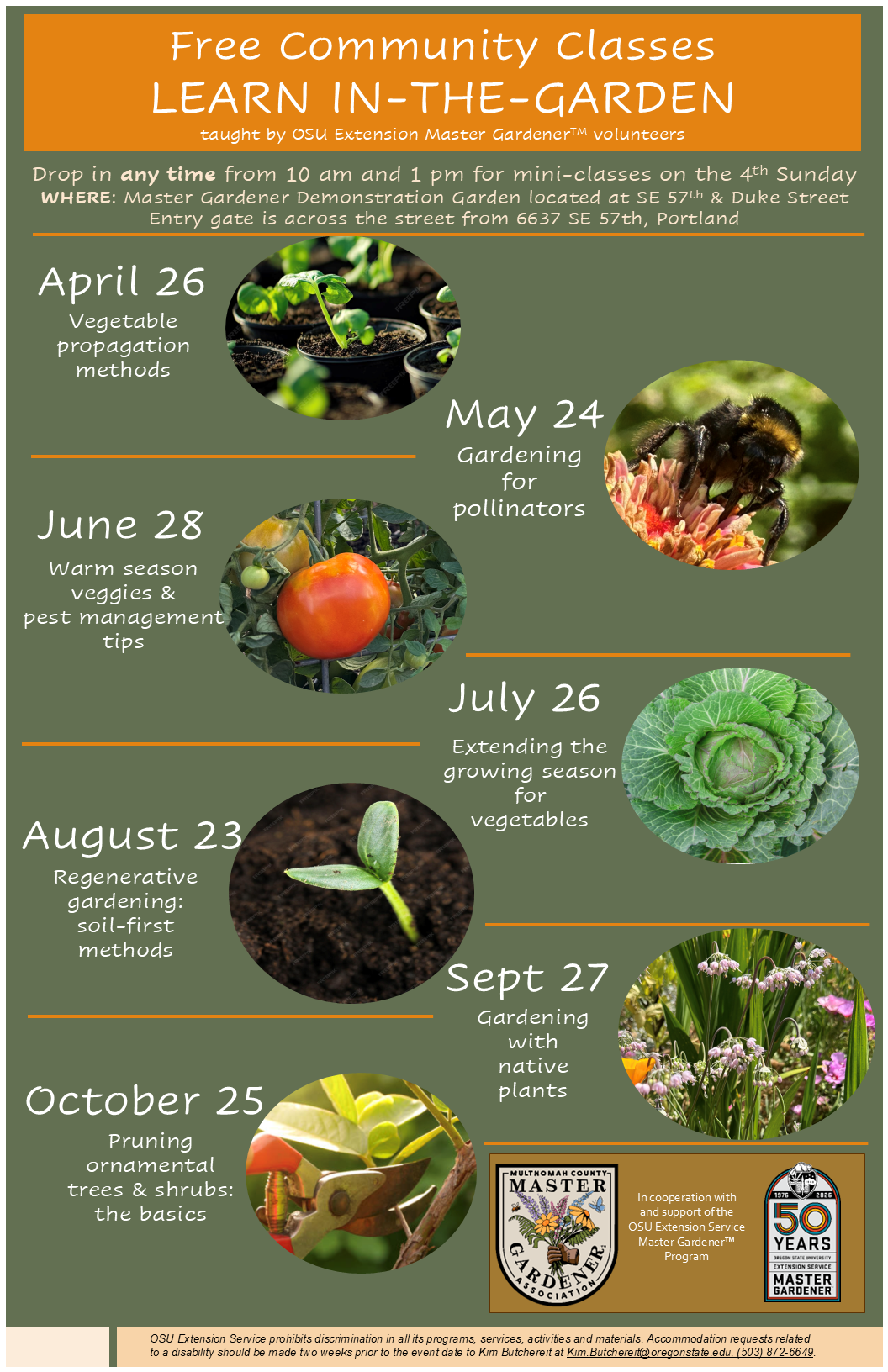 Every 4th Sunday from April to October, OSU Extension Service Master Gardener volunteers offer short demonstrations and hands-on educational activities at the Multnomah County Master Gardener™ Demonstration Garden near SE 57th and Duke in Portland (map).